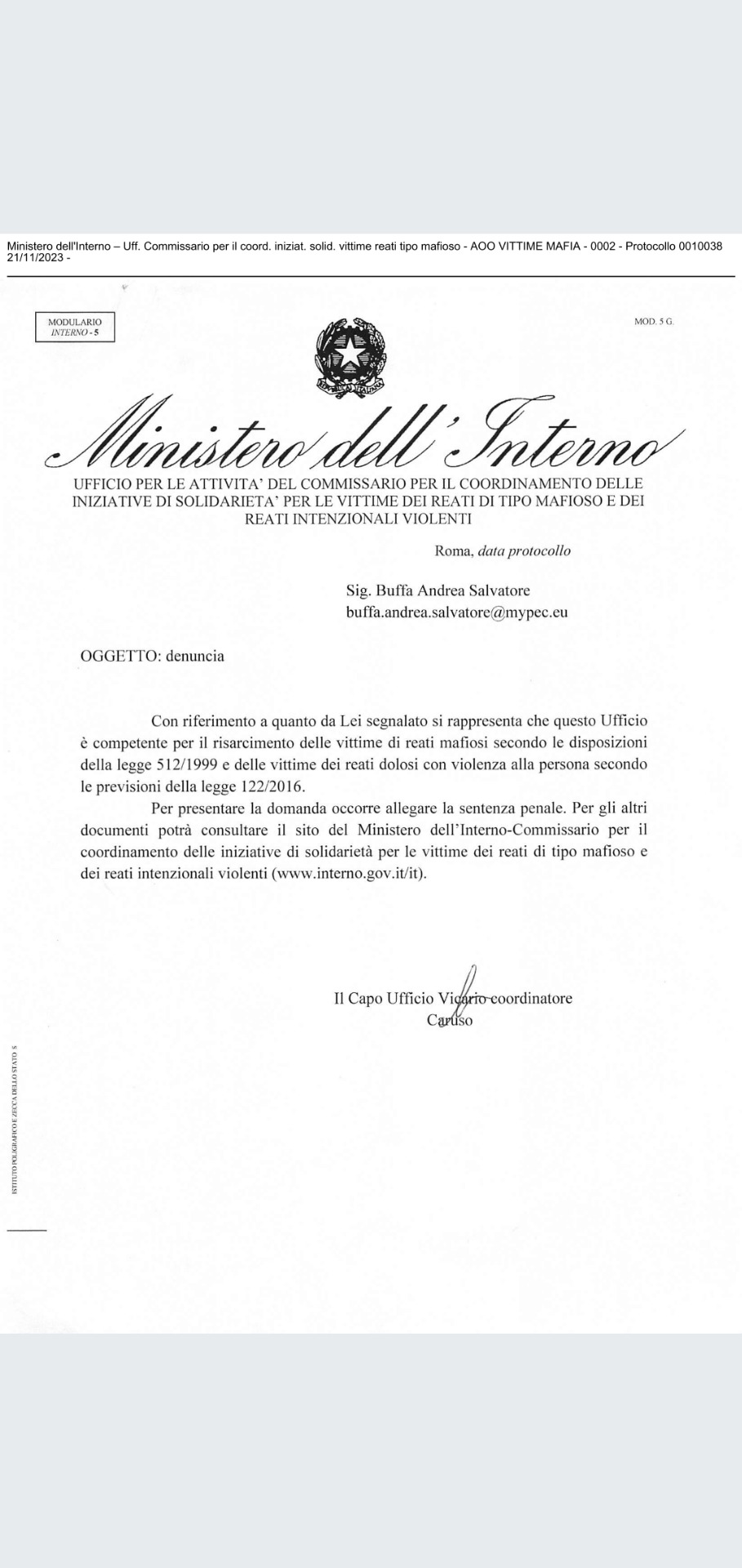 Ministero delfinterno-Ult Commisaarno per i coord, ingat altid vittime reati tipo mafioso. ADO VITTIME MAFIA-0002-Protocollo 1010038